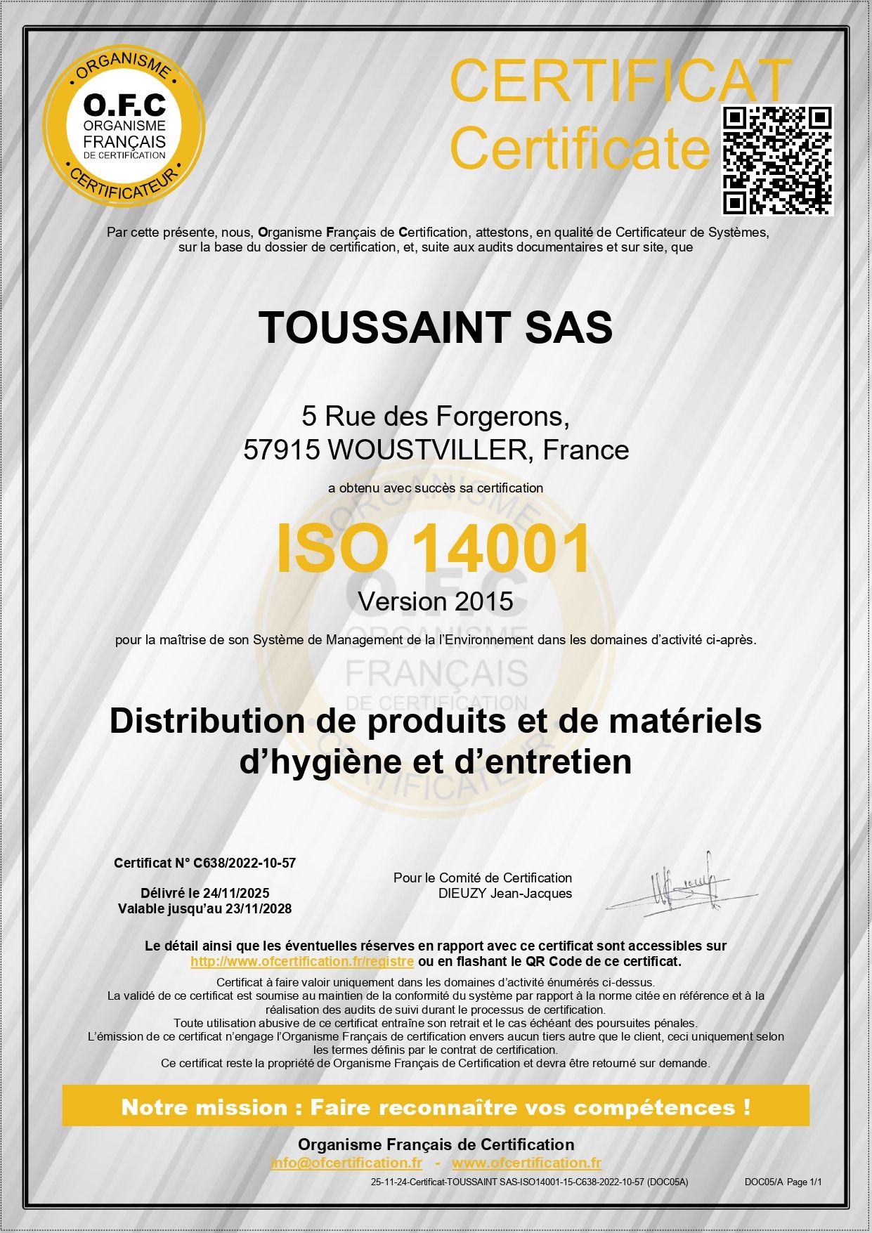 Dans le cadre de sa démarche RSE, TOUSSAINT s’engage à oeuvrer pour le respect de l’environnement et de la réglementation en vigueur.